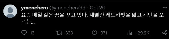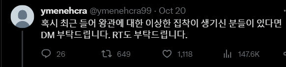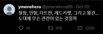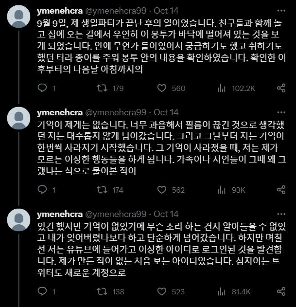 Корейский:얼마 전부터 저는 이상한 일들을 겪고 있습니다. 이 이상한 종이를 주운 후부터 모든 일이 시작되었습니다. 이 종이에 대해 알고계시거나 저와 같은 일을 겪으신 분들은 저에게 DM부탁드립니다.9월 9일, 제 생일파티가 끝난 후의 일이었습니다. 친구들과 함께 놀고 집에 오는 길에서 우연히 이 봉투가 바닥에 떨어져 있는 것을 보게 되었습니다. 안에 무언가 들어있어서 궁금하기도 했고 취하기도 했던 터라 종이를 주워 봉투 안의 내용을 확인하였습니다. 확인한 이후부터의 다음날 아침까지의기억이 제게는 없습니다. 너무 과음해서 필름이 끊긴 것으로 생각했던 저는 대수롭지 않게 넘어갔습니다. 그리고 그날부터 저는 기억이 한번씩 사라지기 시작했습니다. 그 기억이 사라졌을 때, 저는 제가 모르는 이상한 행동들을 하게 됩니다. 가족이나 지인들이 그때 왜 그랬냐는 식으로 물어본 적이있긴 했지만 기억이 없었기에 무슨 소리 하는 건지 알아들을 수 없었고 내가 잊어버렸나보다 하고 단순하게 넘어갔습니다. 하지만 며칠 전 저는 유튜브에 들어가고 이상한 아이디로 로그인된 것을 발견합니다. 제가 만든 적이 없는 처음 보는 아이디였습니다. 심지어는 트위터도 새로운 계정으로로그인되어 있었습니다. 지금 트윗을 올리고 있는 이 계정이 바로 그 계정입니다. 새로운 계정이 생기는 것들쯤이야 별거 아니니 그냥 넘어갈 수 있습니다. 하지만 어제 트위터에 들어와 보니 이상한 사진이 하나 올라와 있었고 휴대폰을 해킹당한 줄 알고 놀란 채로 친구들에게 고민을 토로했습니다.친구들은 일단 무서우니 사진부터 삭제하라고 하여 삭제하였습니다. 그러나 오늘 다시 들어와 보니 같은 사진이 또 올라와 있었습니다. 아무튼 친구들은 요새 들어 제가 다른 사람 같았다며 친구가 그리던 왕관 그림을 찢기도 또 모르는 사람 가방에 붙어있는 왕관키링을 떼간 적도 있다고 하였습니다.제가 이렇게 공격적인 행동을 하였다는 것이 너무 무섭게 느껴졌고 저는 해결책을 찾고 싶었습니다. 하지만 이상하게도 그때부터 왕관을 찾게 되면 모든 것이 해결될 것이라는 확신이 머릿속을 떠나지 않습니다. 제발 제가 왕관을 찾을 수 있도록 도와주세요. RT 부탁드립니다.