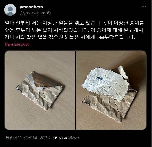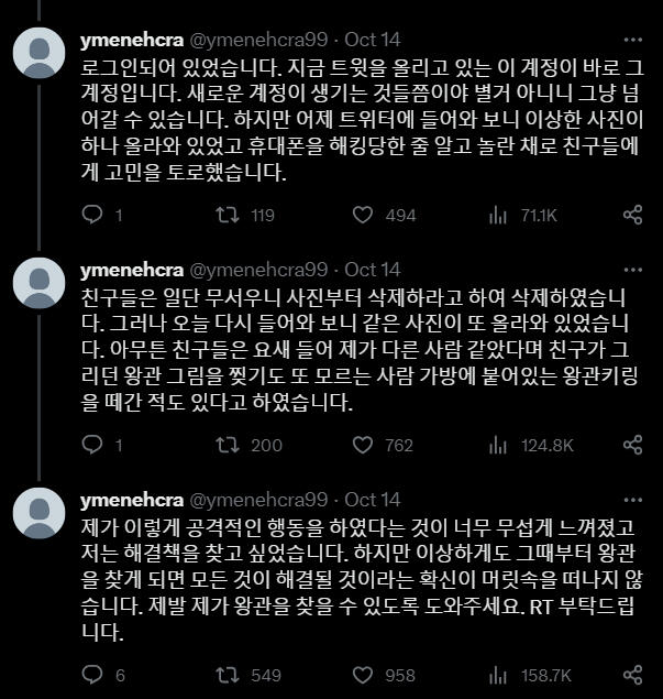 Корейский:얼마 전부터 저는 이상한 일들을 겪고 있습니다. 이 이상한 종이를 주운 후부터 모든 일이 시작되었습니다. 이 종이에 대해 알고계시거나 저와 같은 일을 겪으신 분들은 저에게 DM부탁드립니다.9월 9일, 제 생일파티가 끝난 후의 일이었습니다. 친구들과 함께 놀고 집에 오는 길에서 우연히 이 봉투가 바닥에 떨어져 있는 것을 보게 되었습니다. 안에 무언가 들어있어서 궁금하기도 했고 취하기도 했던 터라 종이를 주워 봉투 안의 내용을 확인하였습니다. 확인한 이후부터의 다음날 아침까지의기억이 제게는 없습니다. 너무 과음해서 필름이 끊긴 것으로 생각했던 저는 대수롭지 않게 넘어갔습니다. 그리고 그날부터 저는 기억이 한번씩 사라지기 시작했습니다. 그 기억이 사라졌을 때, 저는 제가 모르는 이상한 행동들을 하게 됩니다. 가족이나 지인들이 그때 왜 그랬냐는 식으로 물어본 적이있긴 했지만 기억이 없었기에 무슨 소리 하는 건지 알아들을 수 없었고 내가 잊어버렸나보다 하고 단순하게 넘어갔습니다. 하지만 며칠 전 저는 유튜브에 들어가고 이상한 아이디로 로그인된 것을 발견합니다. 제가 만든 적이 없는 처음 보는 아이디였습니다. 심지어는 트위터도 새로운 계정으로로그인되어 있었습니다. 지금 트윗을 올리고 있는 이 계정이 바로 그 계정입니다. 새로운 계정이 생기는 것들쯤이야 별거 아니니 그냥 넘어갈 수 있습니다. 하지만 어제 트위터에 들어와 보니 이상한 사진이 하나 올라와 있었고 휴대폰을 해킹당한 줄 알고 놀란 채로 친구들에게 고민을 토로했습니다.친구들은 일단 무서우니 사진부터 삭제하라고 하여 삭제하였습니다. 그러나 오늘 다시 들어와 보니 같은 사진이 또 올라와 있었습니다. 아무튼 친구들은 요새 들어 제가 다른 사람 같았다며 친구가 그리던 왕관 그림을 찢기도 또 모르는 사람 가방에 붙어있는 왕관키링을 떼간 적도 있다고 하였습니다.제가 이렇게 공격적인 행동을 하였다는 것이 너무 무섭게 느껴졌고 저는 해결책을 찾고 싶었습니다. 하지만 이상하게도 그때부터 왕관을 찾게 되면 모든 것이 해결될 것이라는 확신이 머릿속을 떠나지 않습니다. 제발 제가 왕관을 찾을 수 있도록 도와주세요. RT 부탁드립니다.